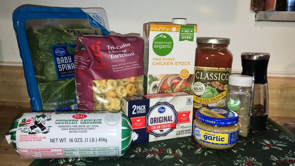 Tortellini Soup! I used dry pasta instead of fresh/frozen and put it in approx 10 minutes before the spinach instead of adding them at the same time. And I used only about two-thirds of a block of cream cheese instead of the entire thing. I also used Country Sausage instead of Italian Sausage. YUM. 10/10 Would make again. ❤