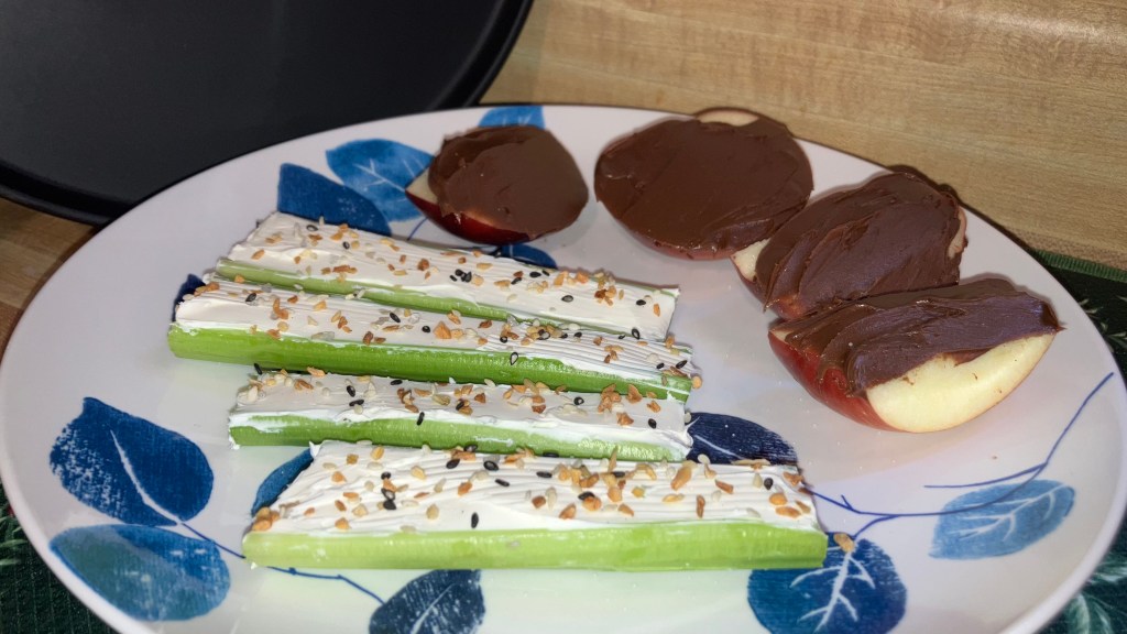 - Celery with cream cheese and everything bagel seasoning. Apples with Nutella.