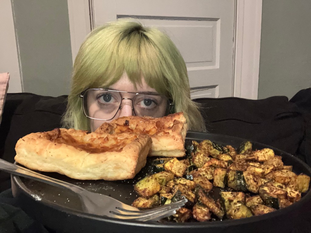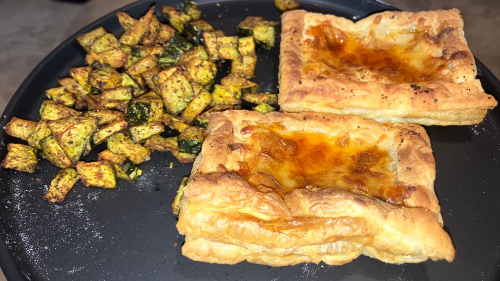 - Air Fryer Acorn Squash plus Puff Pastry with cheese, bacon bits, and honey.